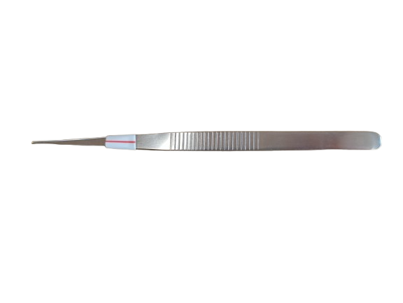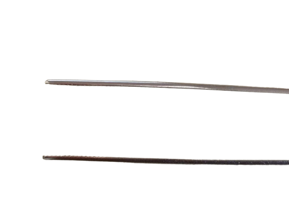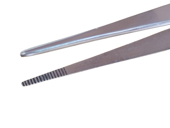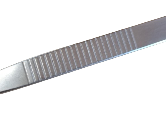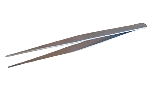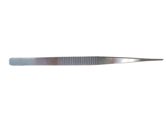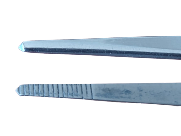 Pinça pega parafuso, reta, com estrias no corpo e na ponta.